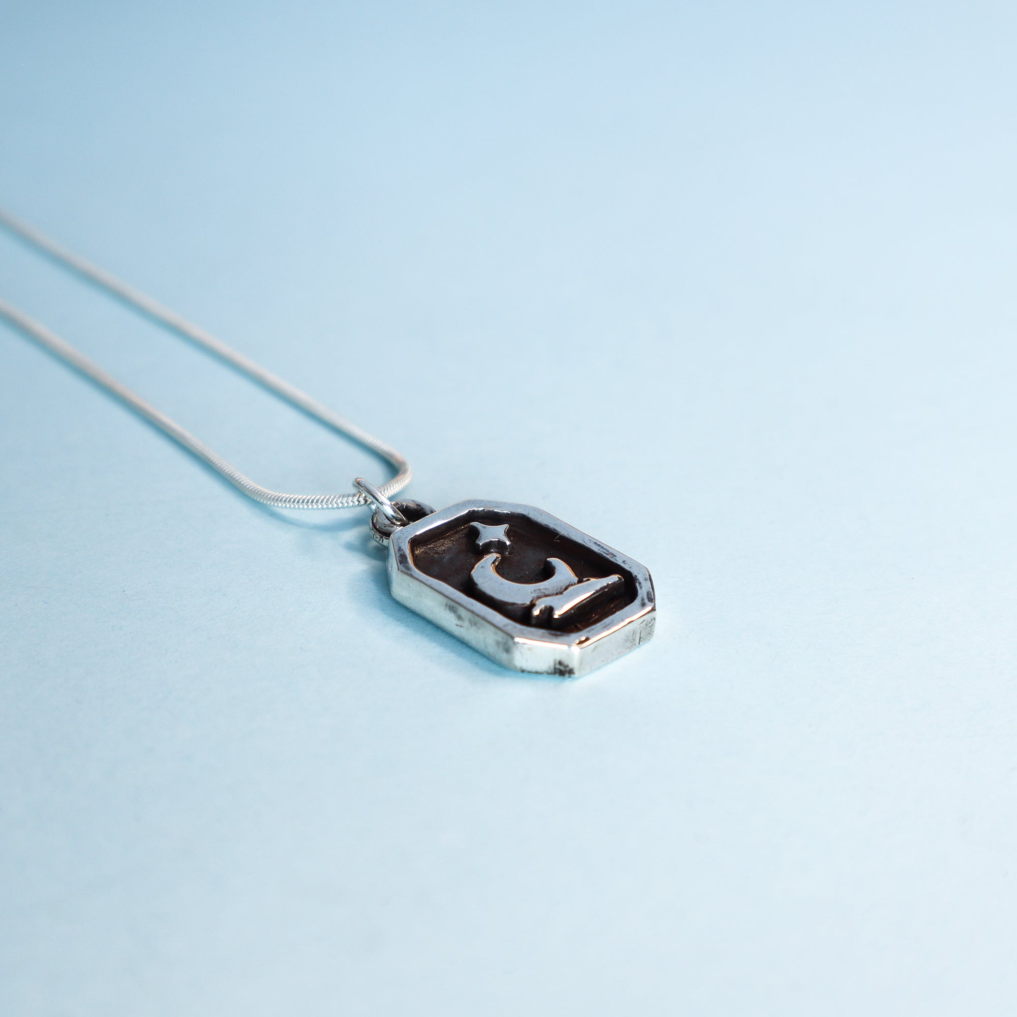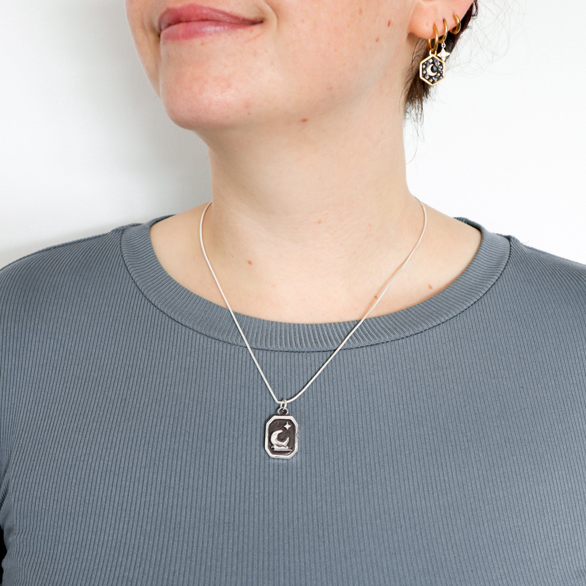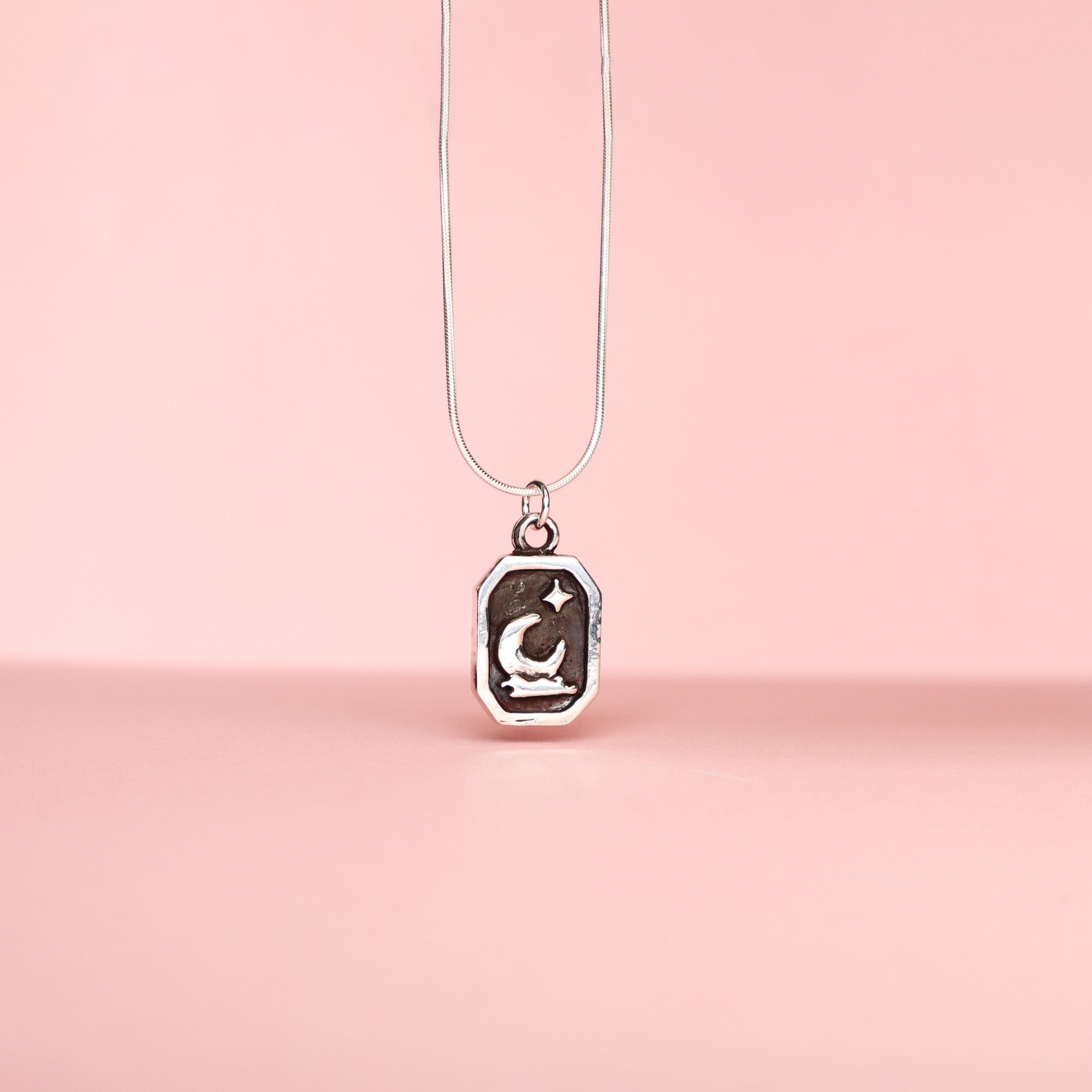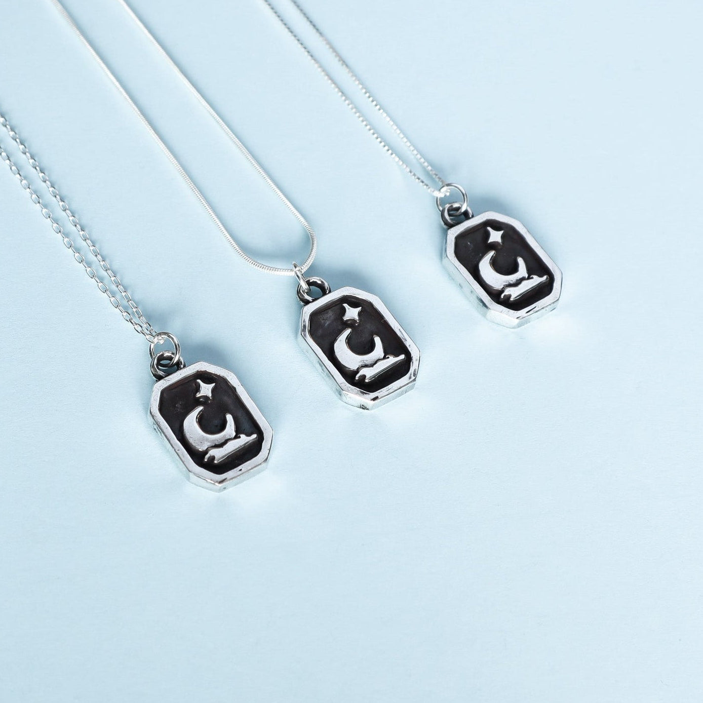美しいリサイクルシルバーのエナメルペンダント。三日月が美しく描かれています。ロストワックス鋳造法を用いて制作されたこの作品は、ワックスを手彫りした後、シルバーに鋳造し、磨き上げられています。