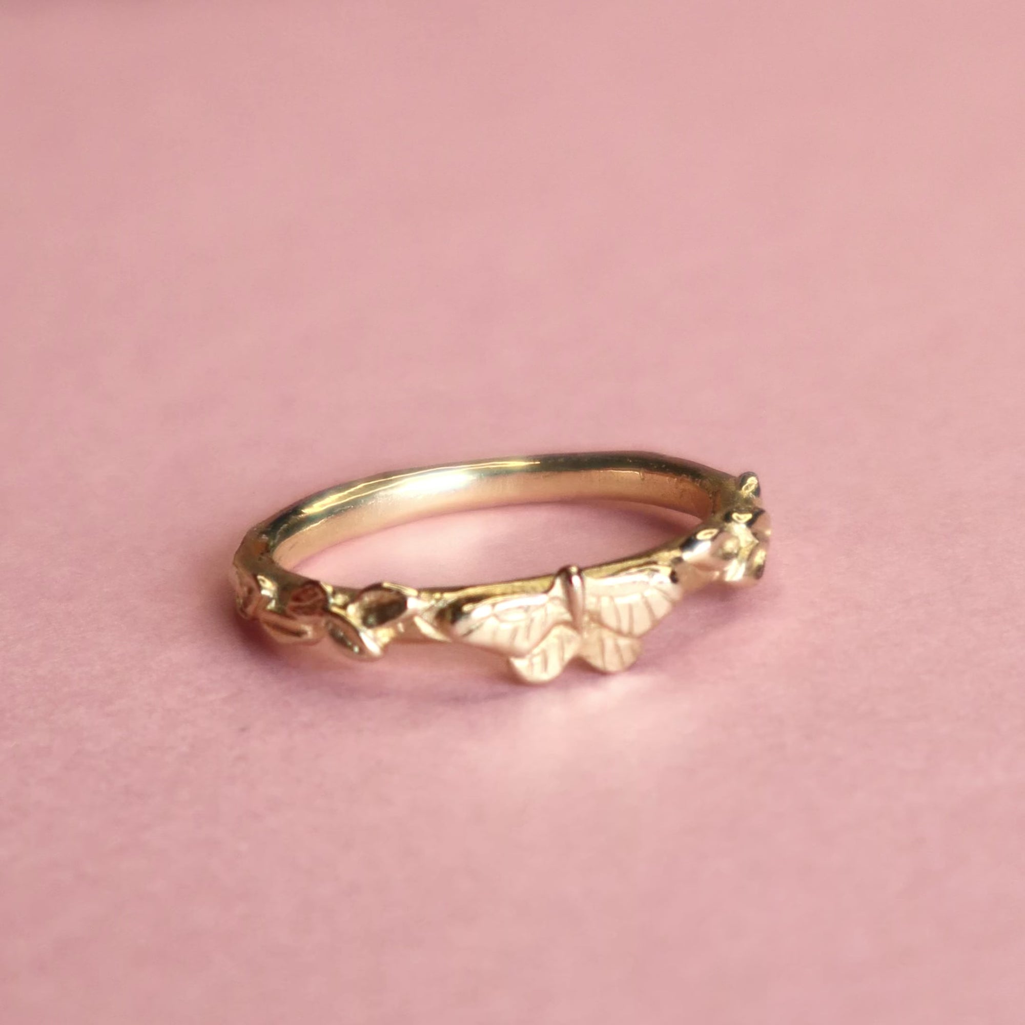 A beautiful butterfly ring available in solid 925 silver or 9ct gold. Created using the lost wax casting method, this piece was hand carved from wax before being cast in silver or 9ct gold.
