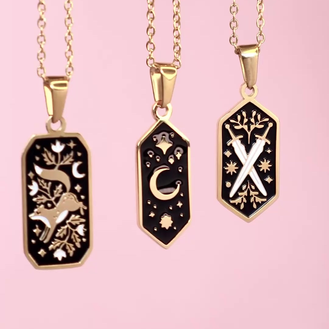 • Two Papio Press Crescent Moon Pendant Enamel Necklaces with hexagonal black pendants—featuring a crescent moon and star—are shown on silver and gold plated chains, displayed on a light surface next to a dark object.