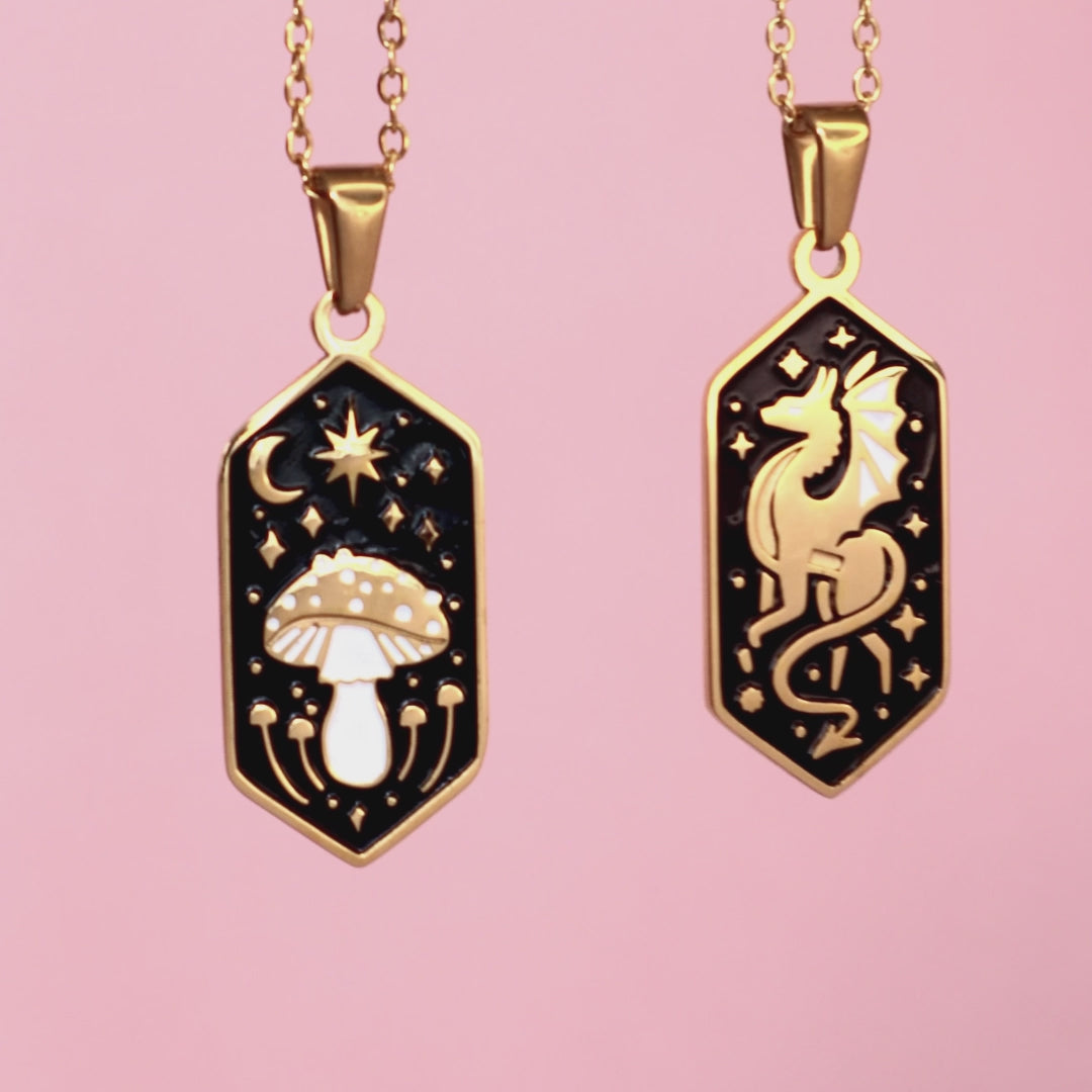• The Papio Press Dragon Pendant Enamel Necklace features a hexagonal charm with an engraved dragon and stars, set on a pale pink background. Pair it with an enamel piece or 18K gold plated accents for extra elegance.