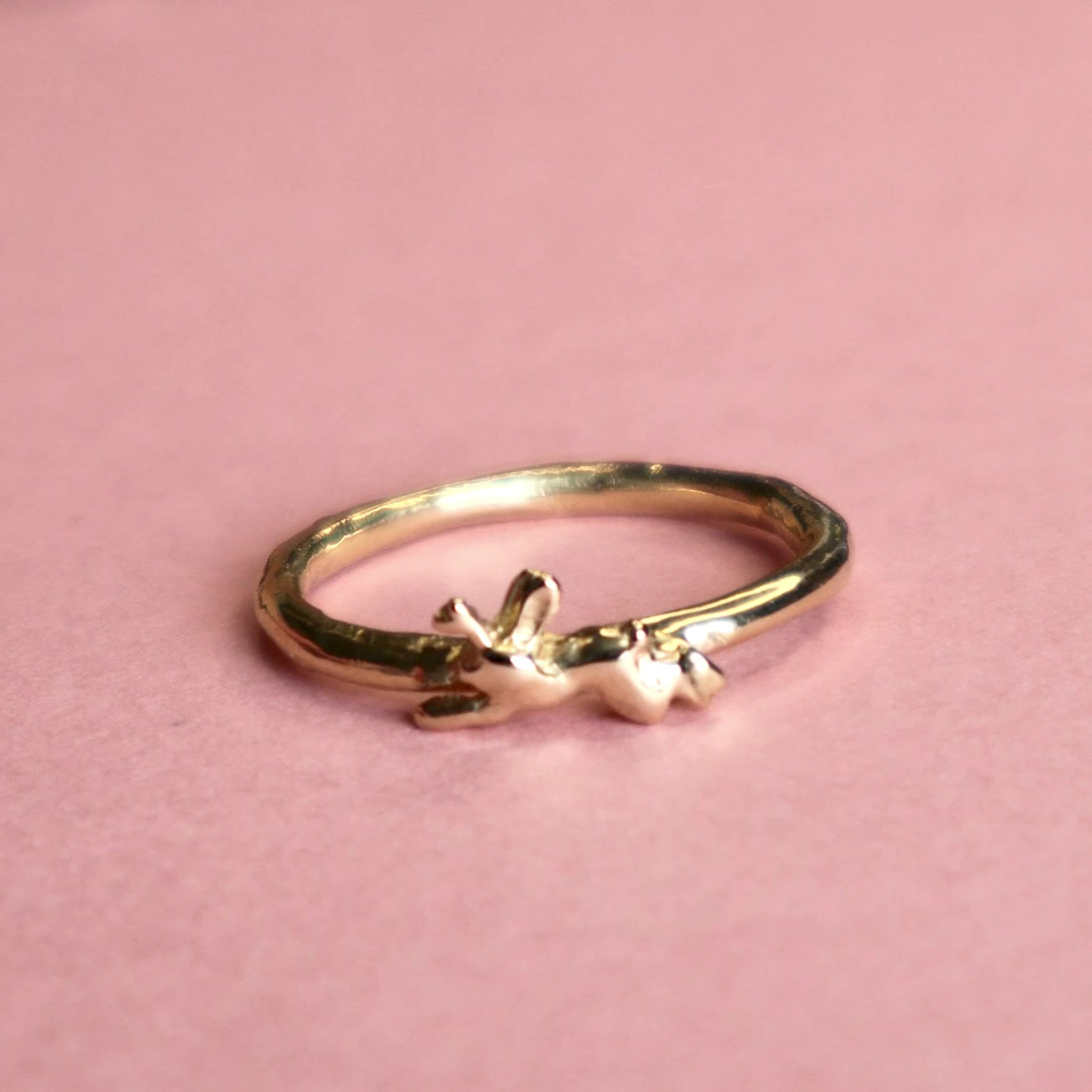 • Gold ring with a small jackalope design on a pink background